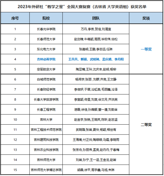 近日,2023年全国“教学之星”大赛结果公布,我校国际交流学院大学英语教学团队(王兵兵、郭颖、武婧琦、孟庆娟、李丹阳)荣获全国大赛复赛一等奖。本届大赛是在全国院校范围内进行选拔推荐的655组教学团队参赛,其中大学英语340组、英语类专业156组、“理解当代中国”159组,可见竞争激烈的程度。